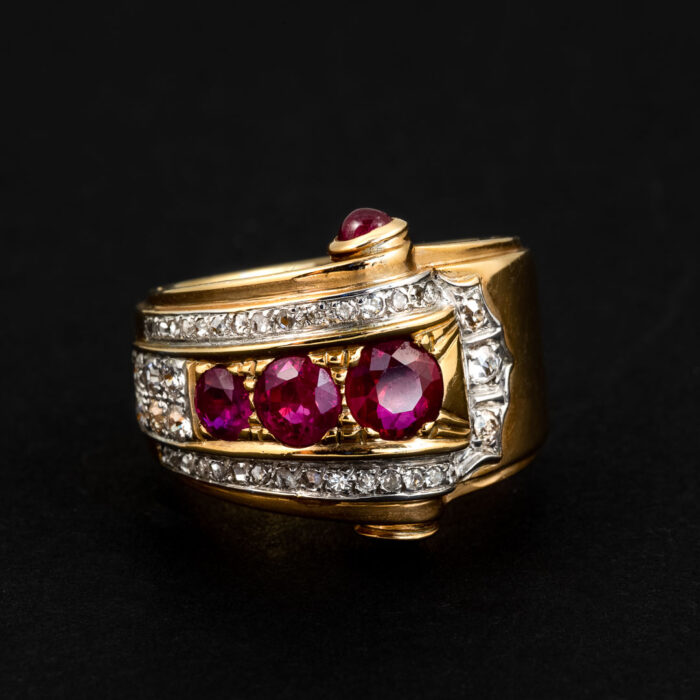Anello in oro giallo 18kt, diamanti naturali, taglio “antico”, di carati complessivi 0.35 e rubini naturali, taglio rotondo e taglio “cabochon”, di carati complessivi 1.30. Questo gioiello è stato prodotto negli anni ’50, di manifattura italiana. Grammi 15.90, misura dito 14