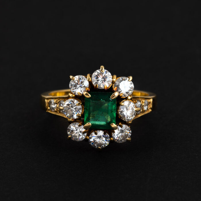 Anello in oro giallo 18kt con diamanti naturali taglio “brillante” per un peso complessivo di carati 1.40 e uno smeraldo naturale di origine colombiana, taglio rettangolare, di carati 0.80. Questo anello è stato prodotto negli anni ’80 di produzione italiana. Grammi 5.80, misura dito 17