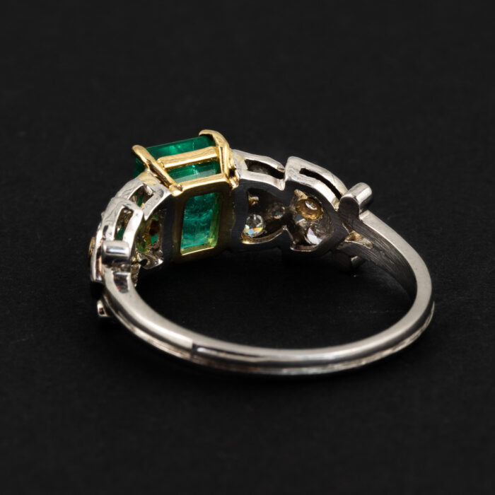 Anello in oro bianco e giallo 18kt con montati diamanti naturali taglio 8/8 di 0.20 carati e uno smeraldo naturale di origine colombiana del peso di 1.20 carati. Questo gioiello è stato prodotto negli anni ’50 di manifattura italiana. Grammi 4.40 misura dito 15